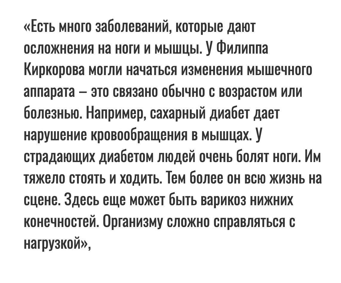 Певец не хочет говорить о своих проблемах со здоровьем. Но он передвигается с большим трудом. Несмотря на худобу, артист выглядит отёкшим и опухшим. На него больно смотреть.